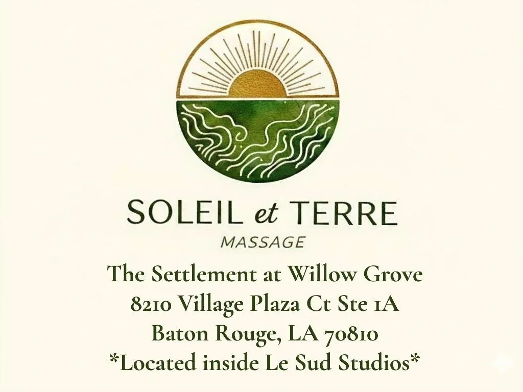 At Soleil et Terre, we believe that true restoration is found when the natural rhythms of the body are returned to a flow state and mind-body awareness is harmonized. Nestled in the heart of Louisiana, this boutique studio was founded as a sanctuary for those seeking to reconnect with their most grounded selves. We are a dedicated retreat where the art of "rhythmic relaxation" meets intentional, "deeply rooted" care. Guided by the philosophy that the body heals best in stillness, we honor a Quiet Zone environment, allowing the outside world to fade so your internal radiance can emerge. Whether unburdening your body through slow-melt tissue work or grounding your energy through our Sole Revival foot therapy, the mission remains the same: to provide a curated, sensory experience that helps you get rooted and feel radiant.
